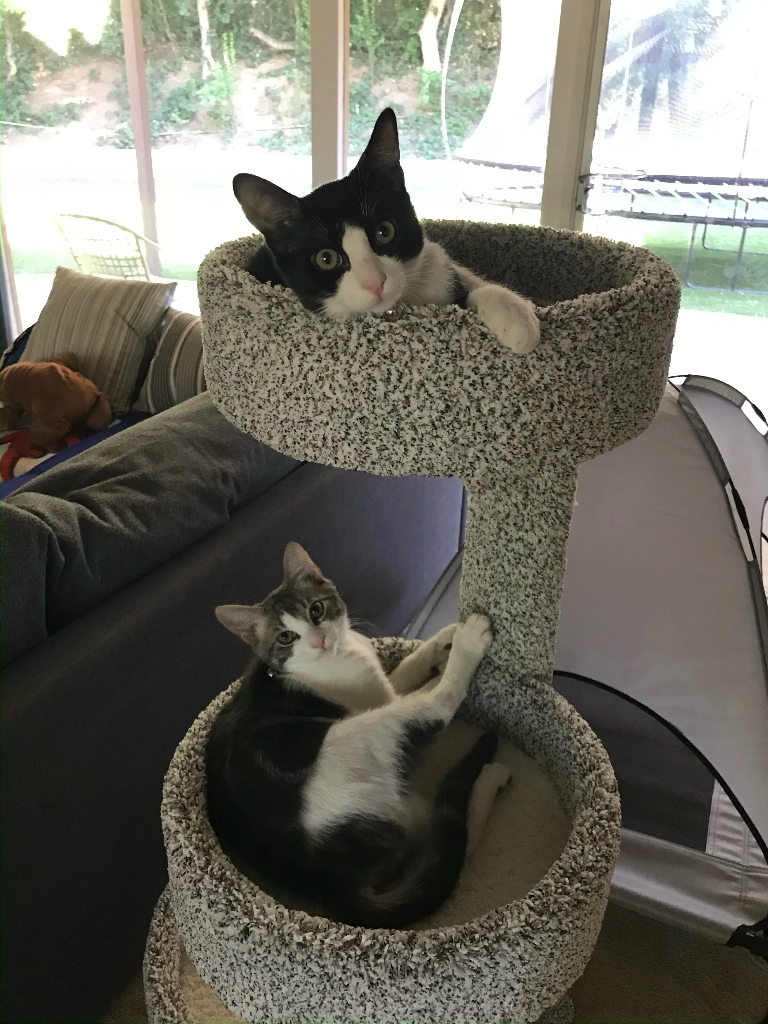 Bonded brothers Ares (grey and white) and Herc (black and white) are from the same litter. Bottle-fed and human loving. They are great with dogs and kids (lived with both for two years). They need a home with no other cats, and they are indoor only (never been outdoors). They are very gentle and docile. Ares loves to cuddle and nap on laps and anywhere people are. Herc is sweet and super goofy. He loves to play with stick toys. They are so gentle, you can trim all of their nails, and they don't mind at all! (it's a miracle!).