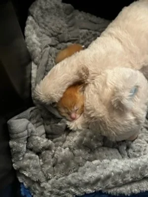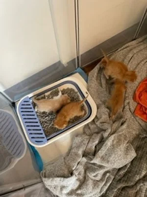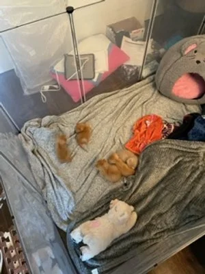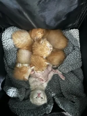 Just over 7 weeks old, these babies were found in a trash can by a truck driver. There were 8 newborns with no mama in sight. One baby didn’t make it, one had a degloved paw & there were 6 other babies. The initial rescuer kept the one with the degloved paw and a sibling for companionship. The wonderful Dawn, drove to Hemet to pick up these 5 sweet orange babies. With a bit of a detour thanks to the Rabbit fire hence their names.