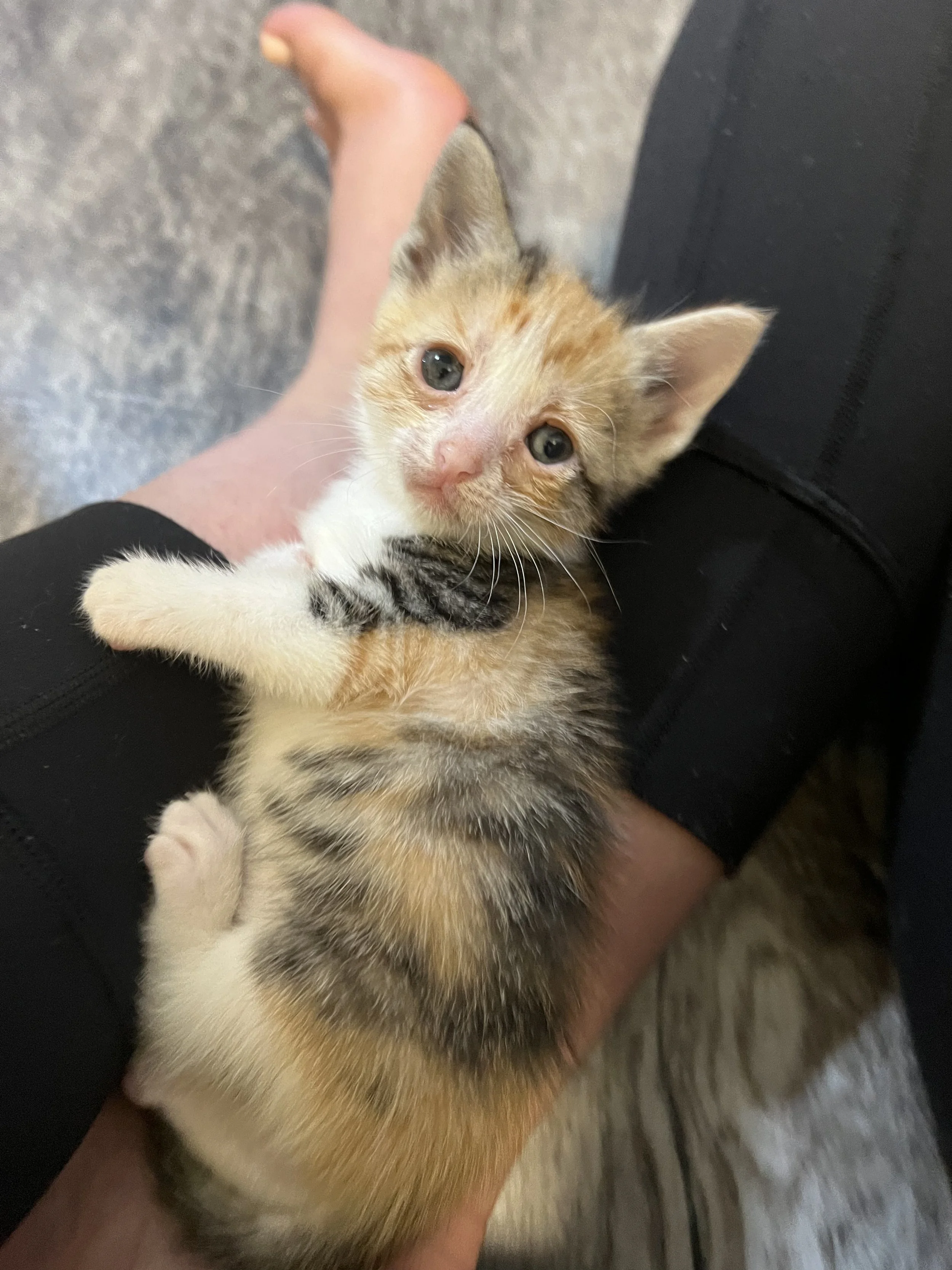 ADOPT Cali born May 15, 2022. Cali has one of the cutest faces we have ever seen. She loves to stare into the eyes of humans melting hearts by her loving gaze. We often find her sleeping on her back arms outstretched boasting a mostly white belly. She loves playing with her sisters and is especially close to Cherluna. (We suggest she is adopted with a sibling or into a home with other cats.