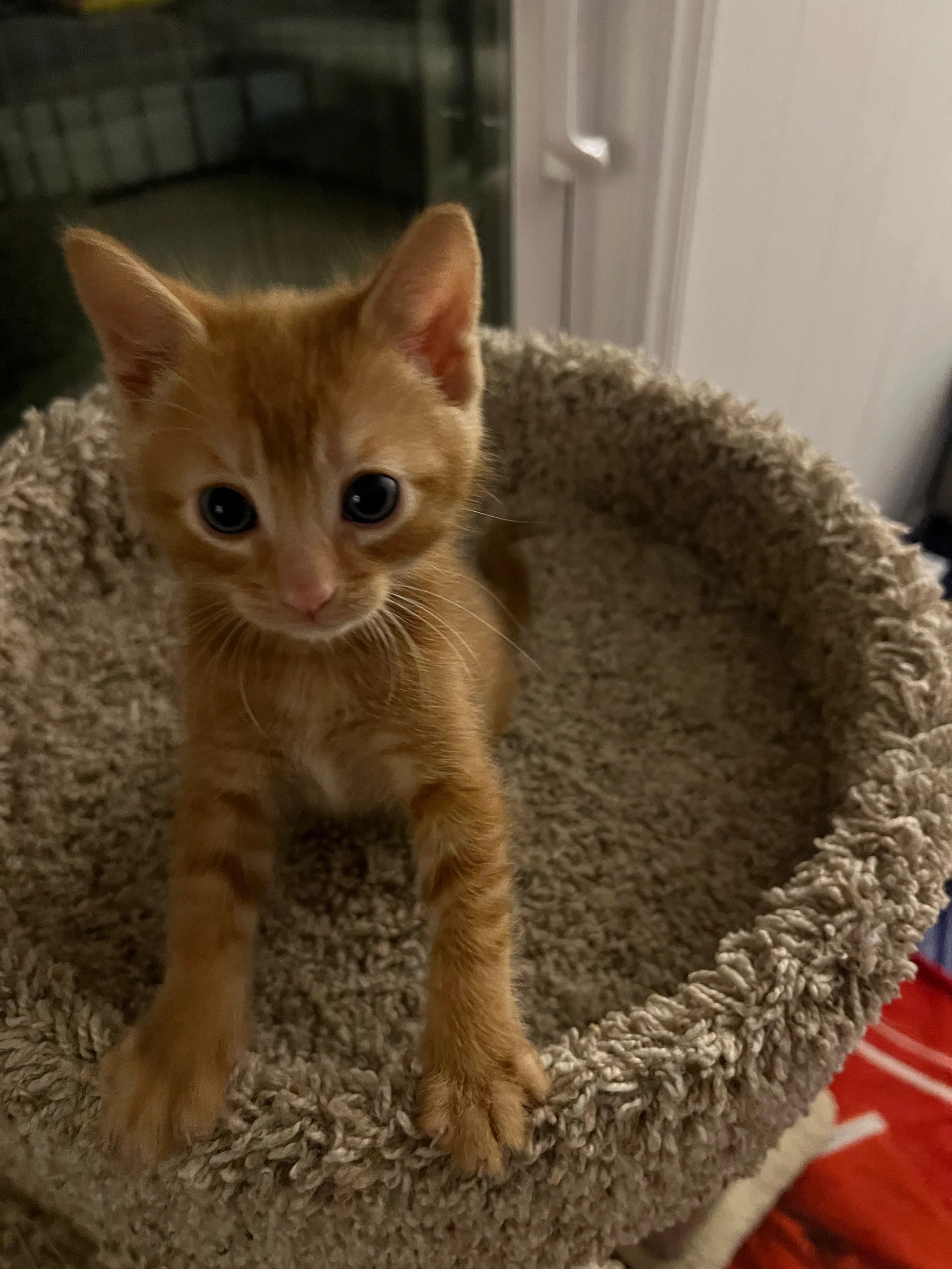 Nickname Cheeto Man. He is a loving dark orange tabby. He loves playing with toys and wrestling with his brothers and sister. He loves to snuggle.