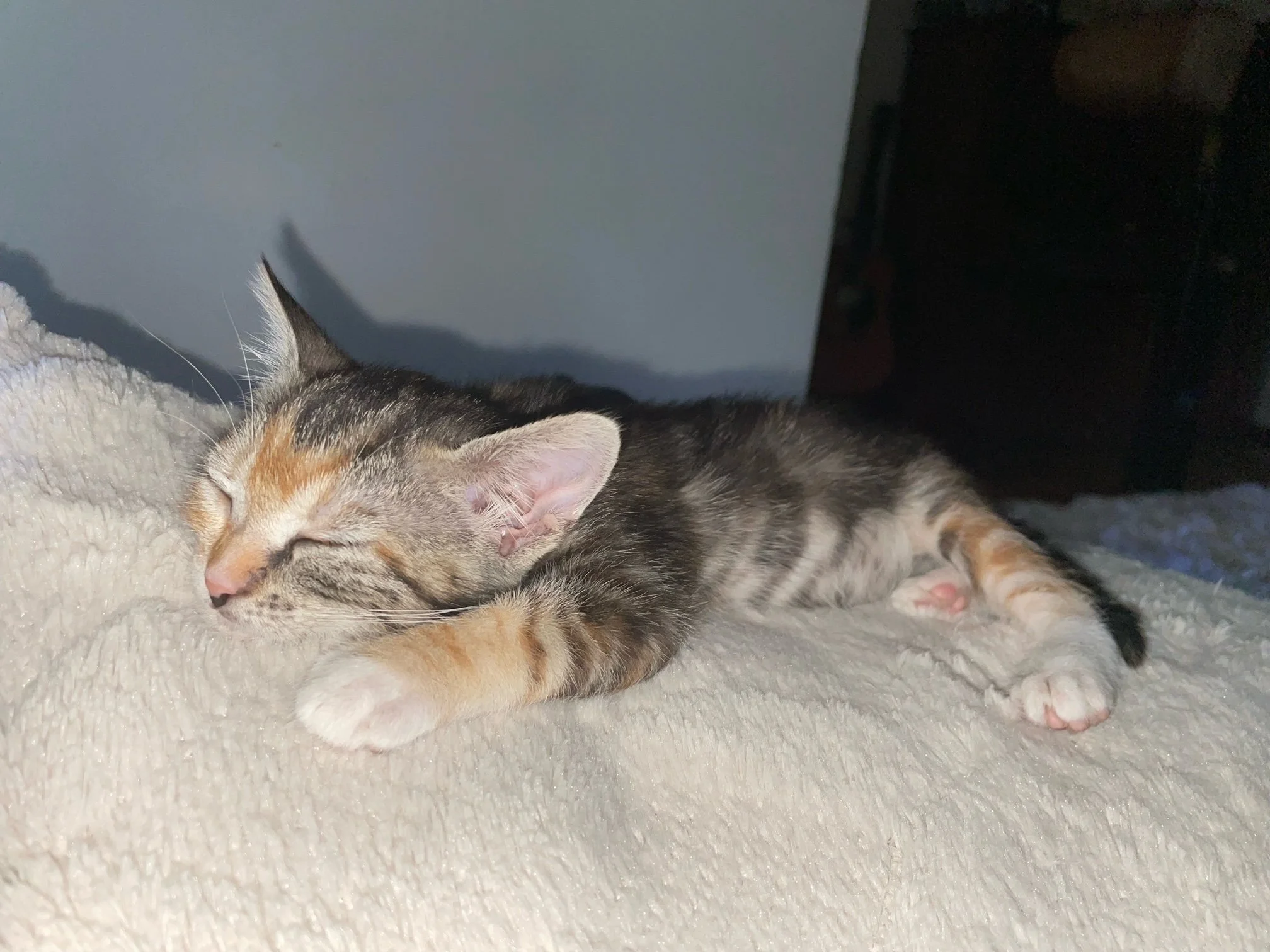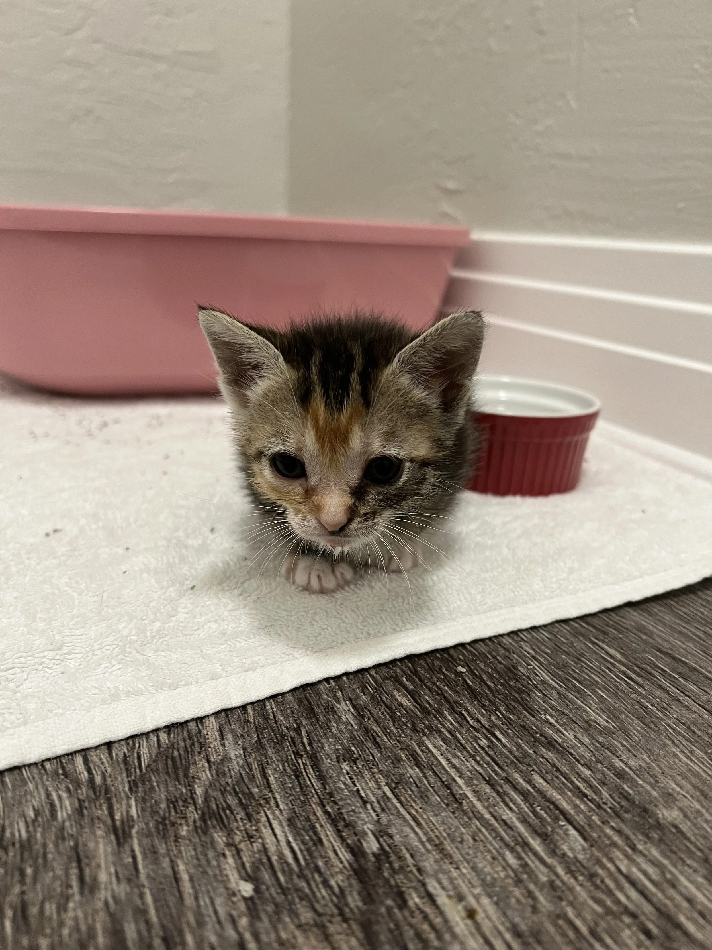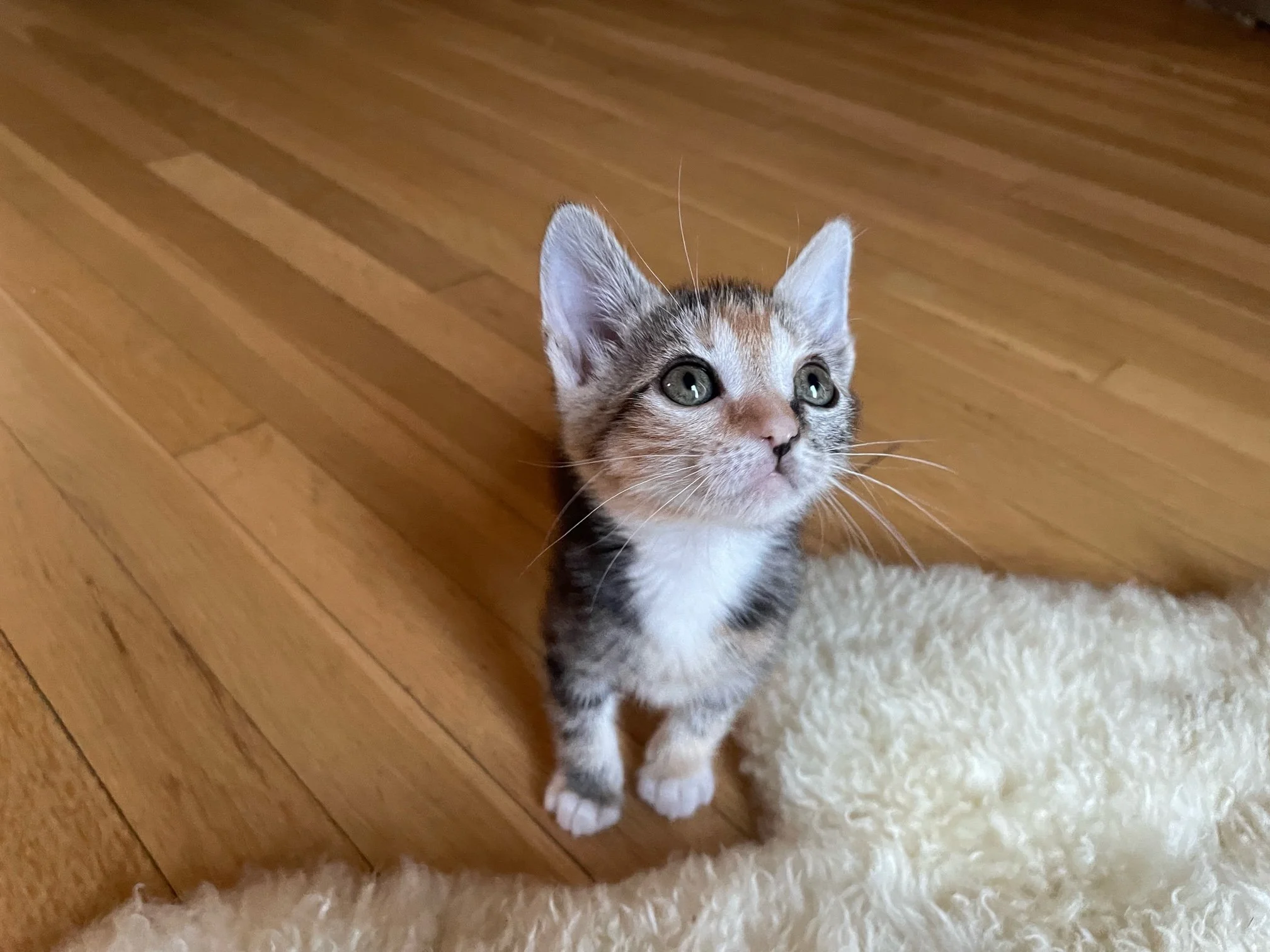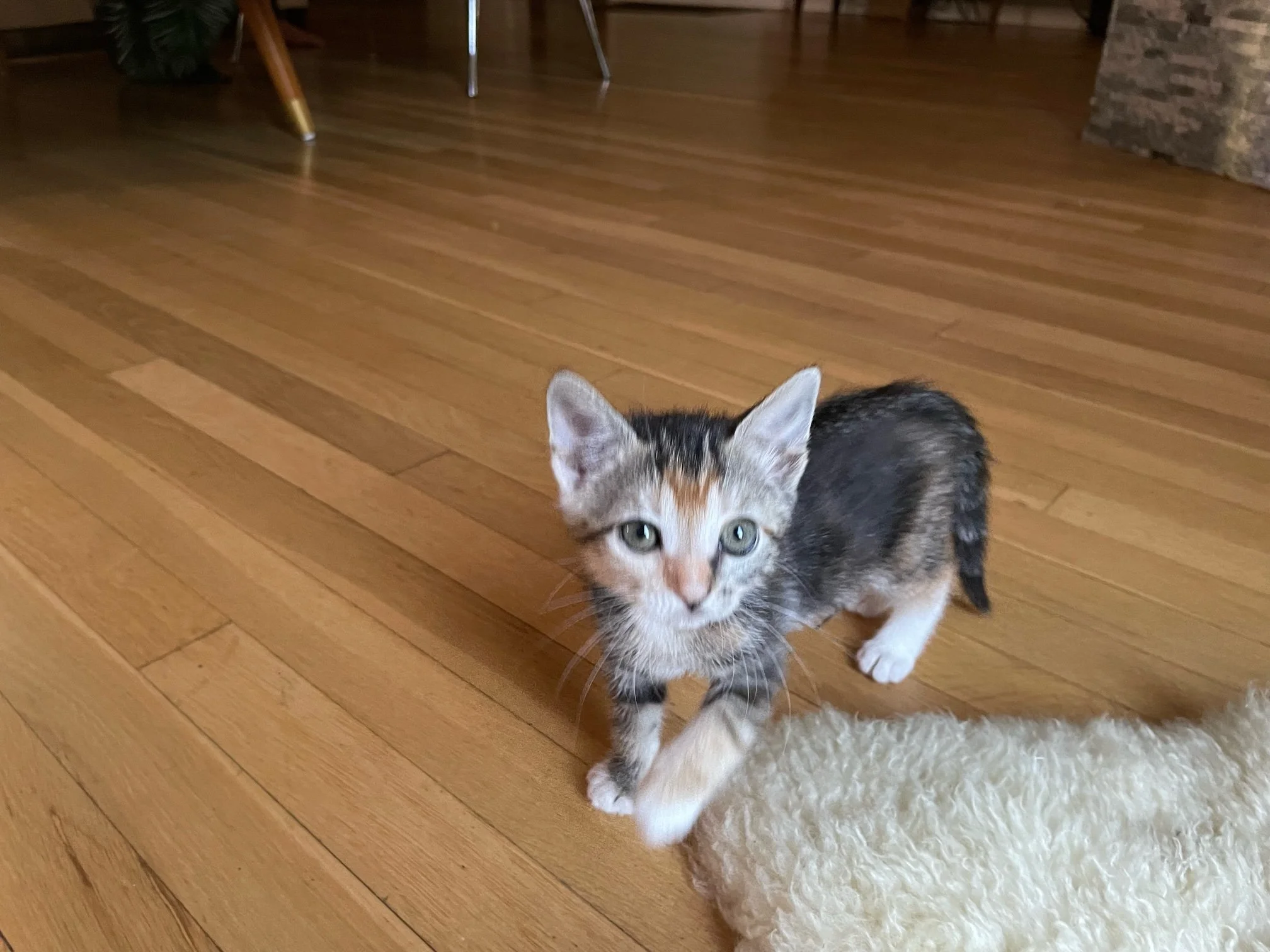 ADOPT Cherluna born May 15, 2022. Cherluna loves to cuddle and purr by your neck. She tends to smile as she languishes in belly scratches. Originally named Cher due to her loud singing meow, she grew into Cherluna based on her playful personality. Her coloring is fun with a little orange only on her face. (She looks like a calico on a darker bearsuit.) She loves playing with her sisters and is especially close to Cali. We suggest she is adopted with a sibling or into a home with other cats.