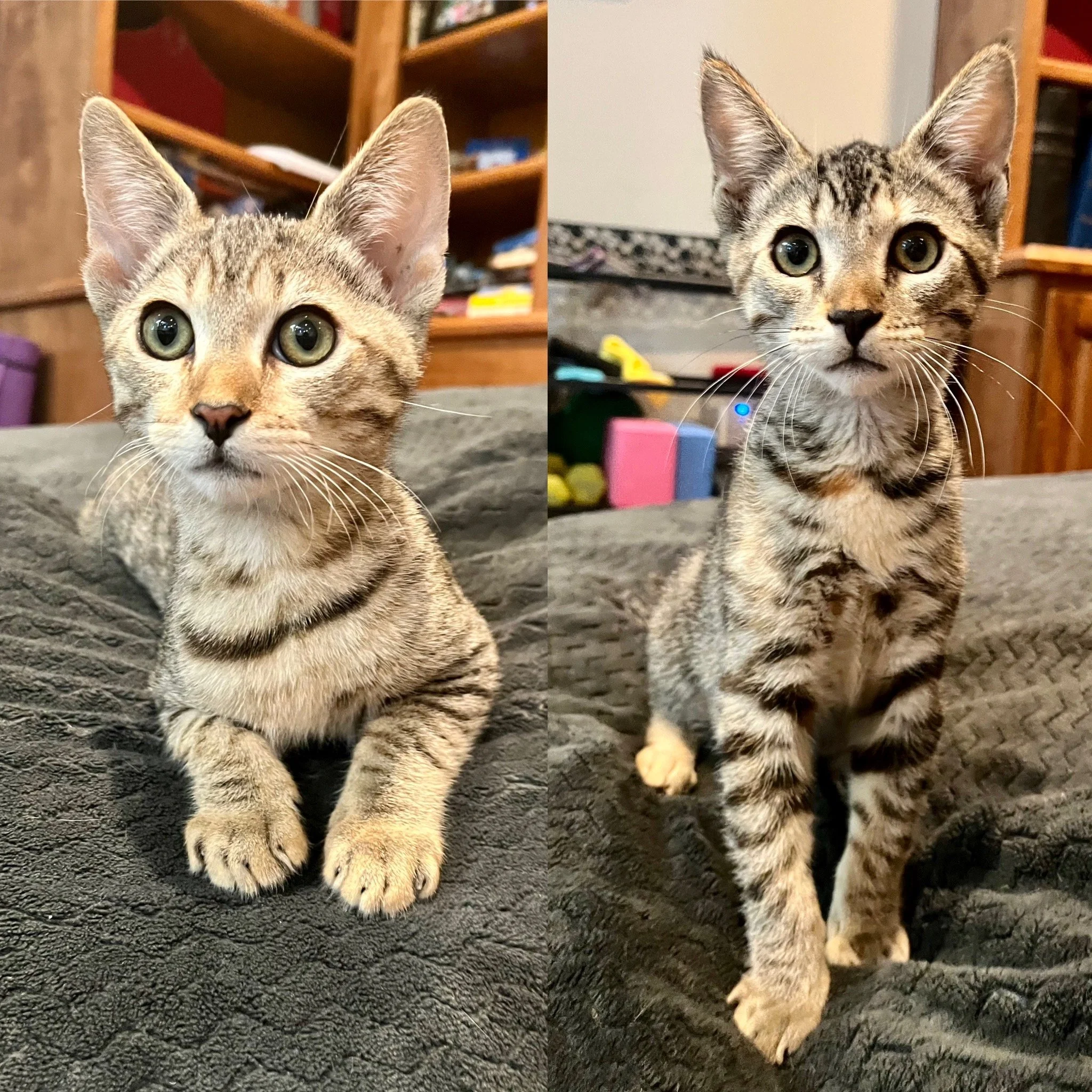 Nova is an adorable 4mo tabby girl. She is fully vetted (dewormed, spayed, microchipped, snap tested negative for fiv/felv, and vaccinated for fvrcp) and ready for adoption. She is a bit shy at first but she warms up quickly and is such a sweetie pie. She’s a super silly and very playful little girl that loves to play with toys and other kitties. She adores pets, especially belly rubs, and is a big fan of cuddles as well. She’s super playful and she especially loves wand toys. She’s a big fan of catnip and will even do somersaults when playing with it. Because she is so young, she needs to go to a home with another cat so she’ll have a friend to play with. She’d love to go home with her brother Felix as they’re both extremely playful and love to wrestle and cuddle together. She’d be the perfect addition to any family.
