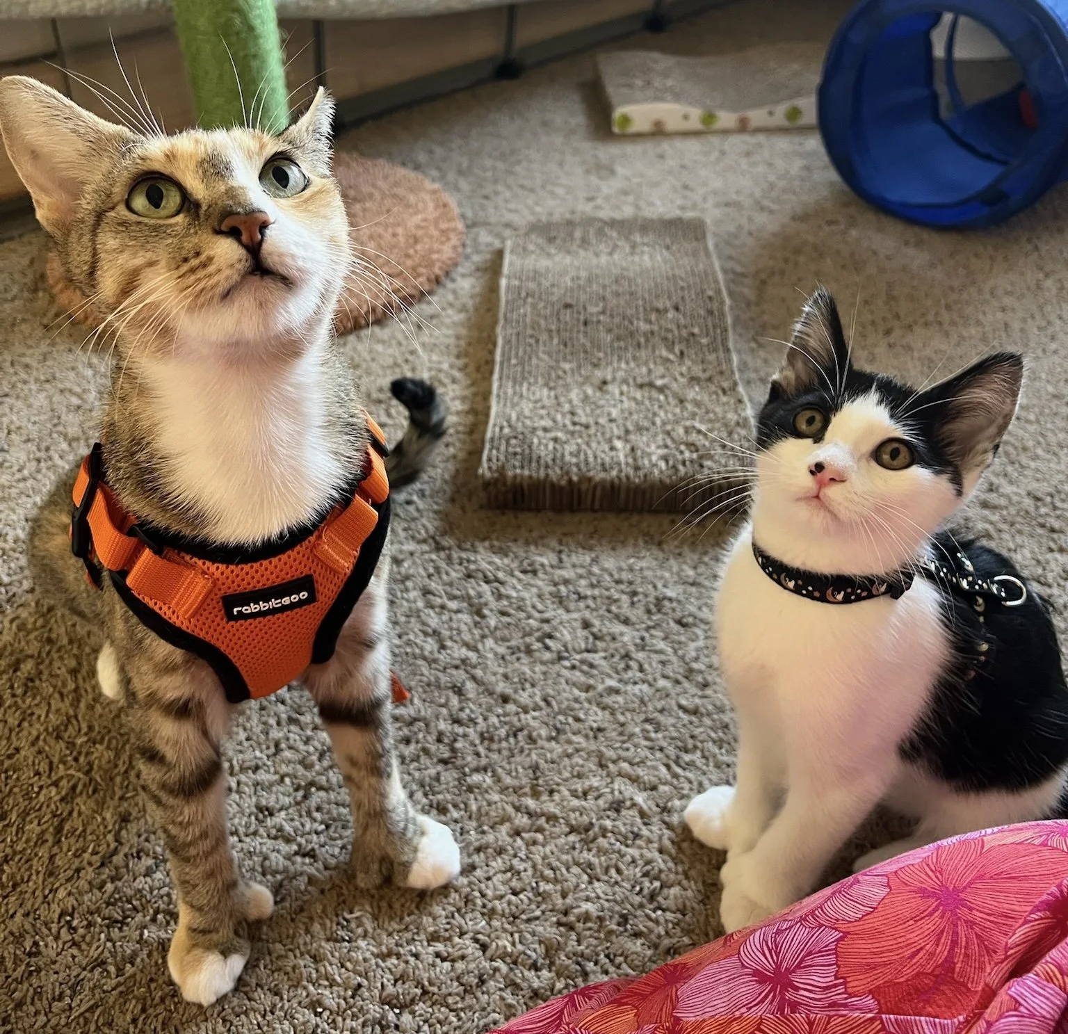 Goldie and Inchworm are a polydactyl mother and daughter team. Goldie was found pregnant and gave birth at the home of our wonderful foster. Inchworm is the last left of Goldies litter. Goldie and Inchworm are extremely bonded and we would prefer for them to get adopted together. Both extremely friendly and halter trained!