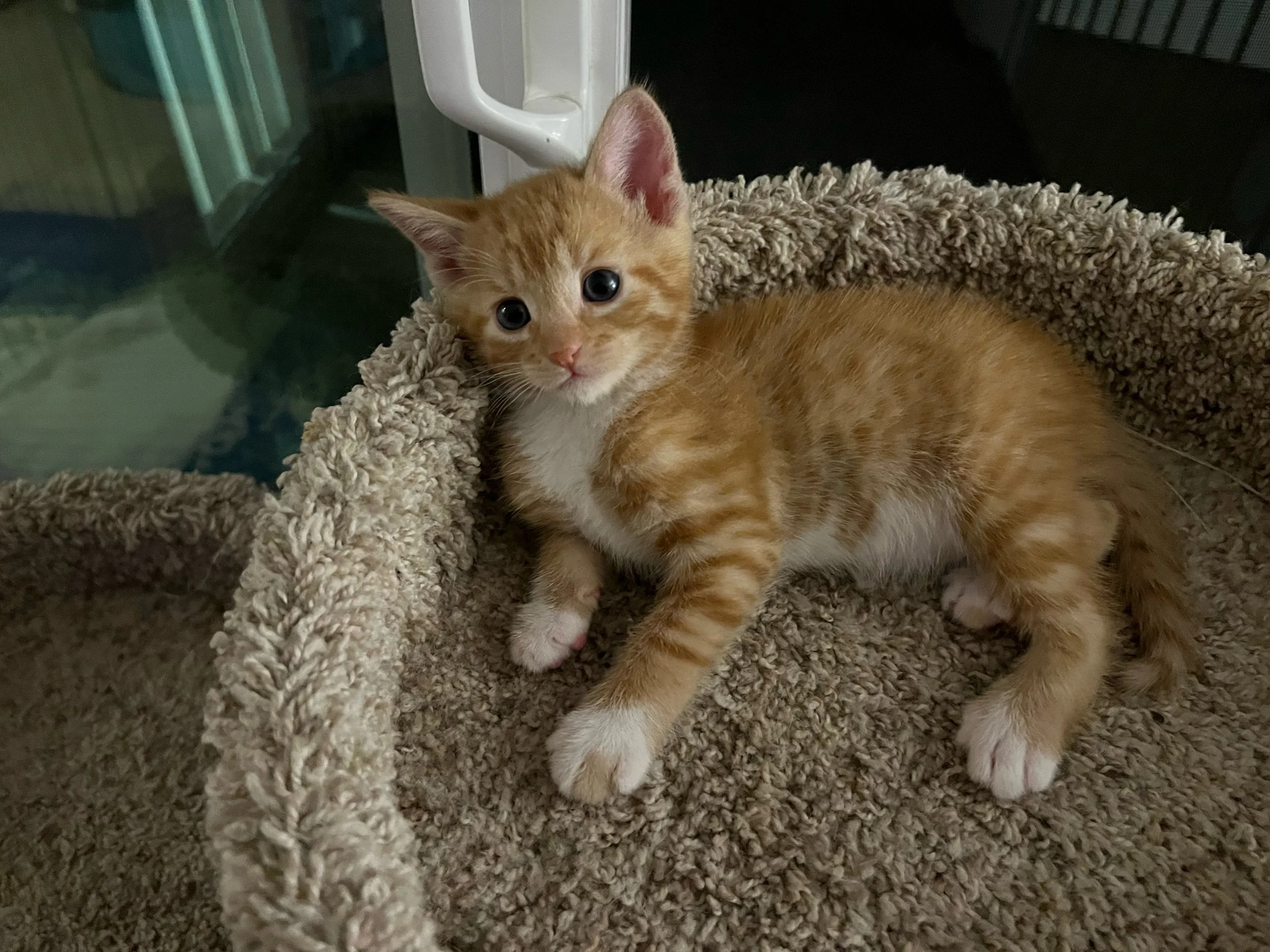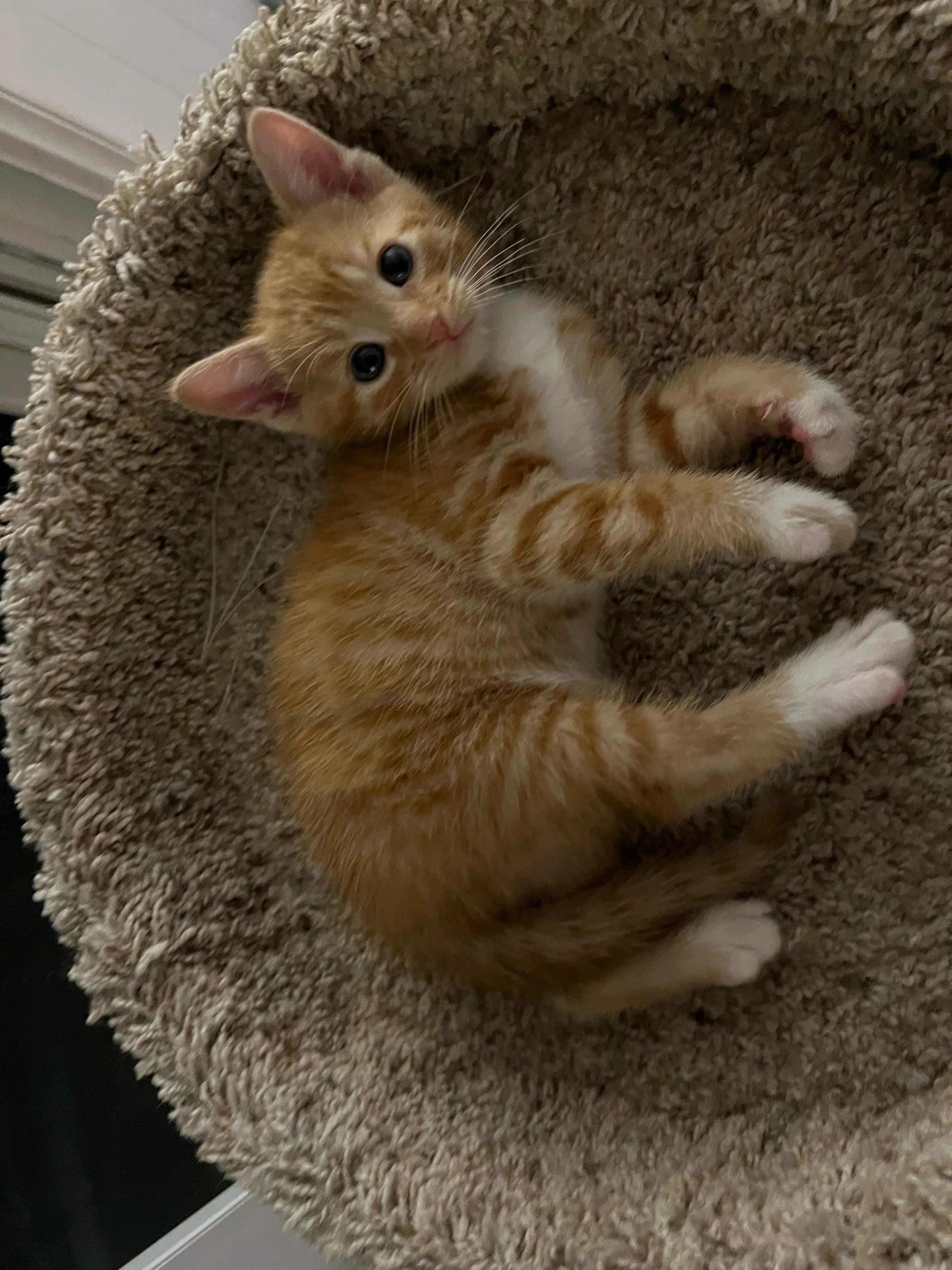 Nickname: Crazy Man. A fearless guy who mastered the 3 tiered kitty tower in about 2 minutes. Goose is a spunky orange tabby that is always up for a cuddle. He’s a big boy who likes to talk to you.