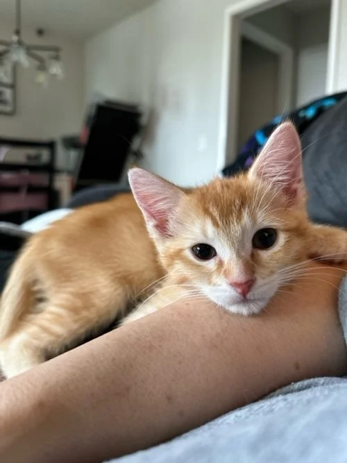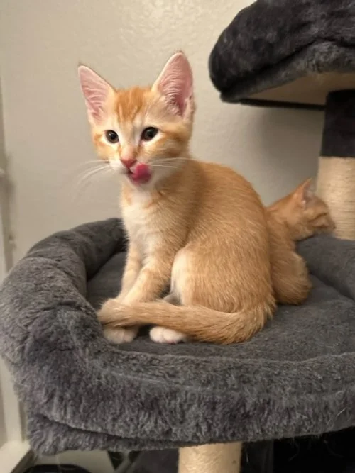 Just over 7 weeks old, these babies were found in a trash can by a truck driver. There were 8 newborns with no mama in sight. One baby didn’t make it, one had a degloved paw & there were 6 other babies. The initial rescuer kept the one with the degloved paw and a sibling for companionship. The wonderful Dawn, drove to Hemet to pick up these 5 sweet orange babies. With a bit of a detour thanks to the Rabbit fire hence their names.