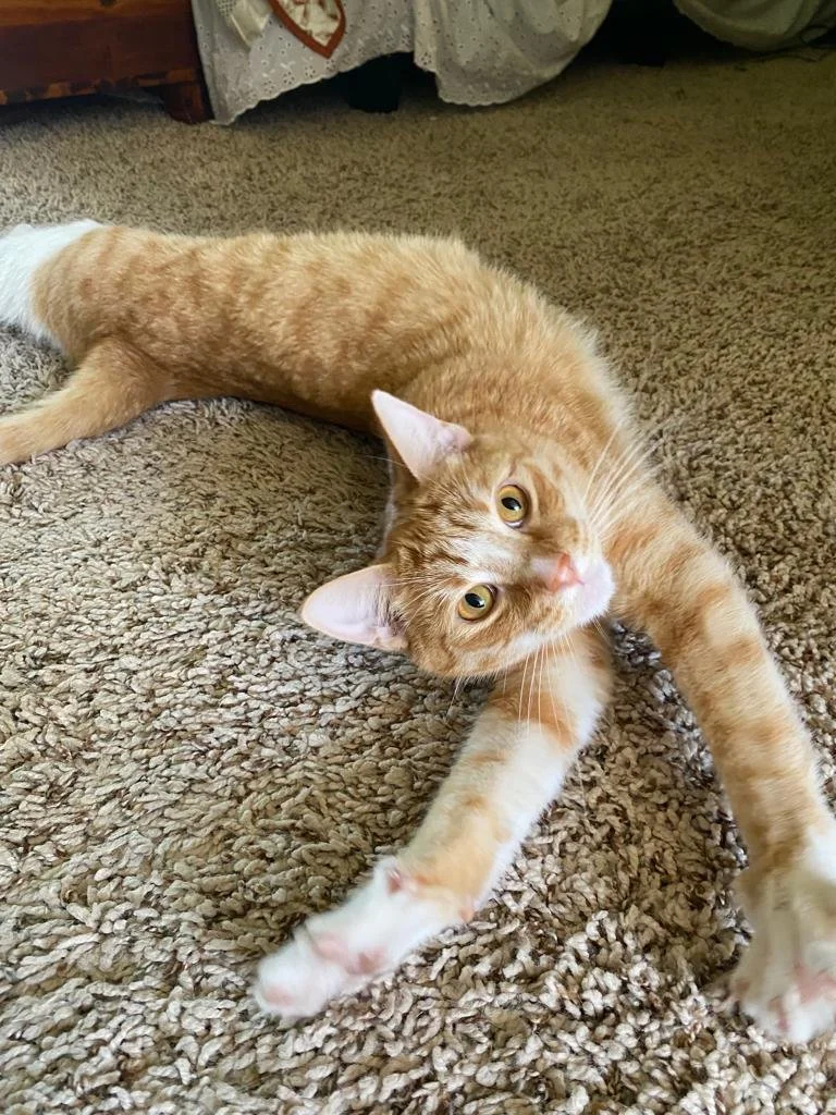Max at 1.5 years old, is an extremely sweet Ginger cat who loves his belly rubbed. He likes to sit on laps and purr. A very laid back cat who loves to sleep and eat. Max is friendly and gets along well with dogs and other friendly cats (he is afraid of dominant cats and cannot live with dominant or aggressive animals). He is not aggressive towards anyone, animals, or children.