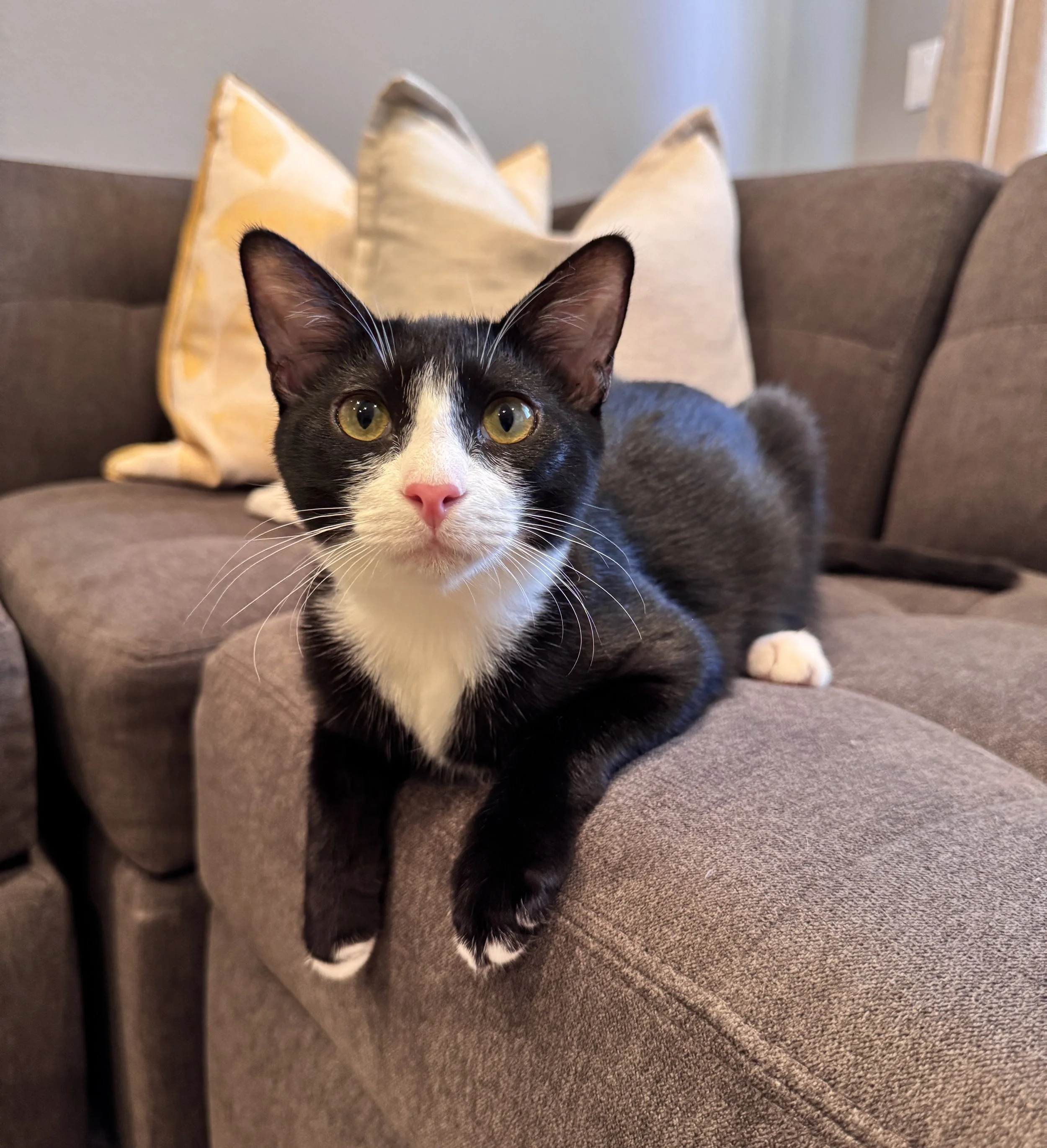 These bonded brothers are almost identical in appearance, but opposite in personality. Gentle, affectionate bonded brothers, Sterling (white front legs) and Max (black front legs, white manicure) have been in foster Julies care since they were 2 days old. They are the ultimate “dog/cat” experience that you hear about. These kittens, “aka apex predators” couldn’t hunt a turtle, but they fetch flying hair ties with precision and speed AND lovingly touch your delicate face with tenderness. Max and Sterling are each 100% perfection and as brothers, they are 200% fun, loving, and entertaining!!