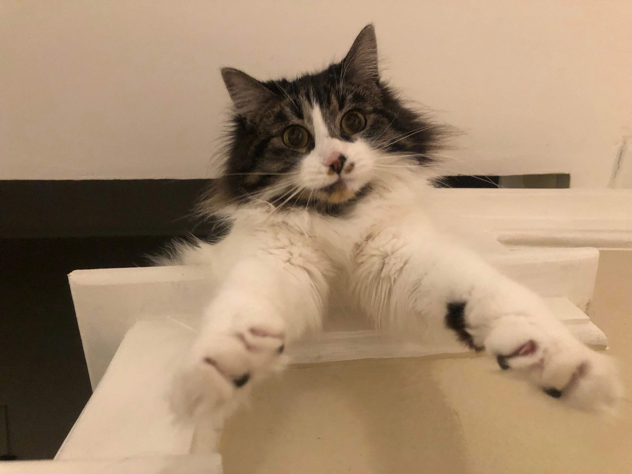 ADOPT MooMoo a beautiful 4 Year old girl. A very social kitty who will follow you around the house everywhere She likes to knead on soft blankets and cuddle She loves to chase after large hair bands and likes a lot of attention. A very gentle and easy going girl who loves people and purrs a lot while cuddling and being pet.