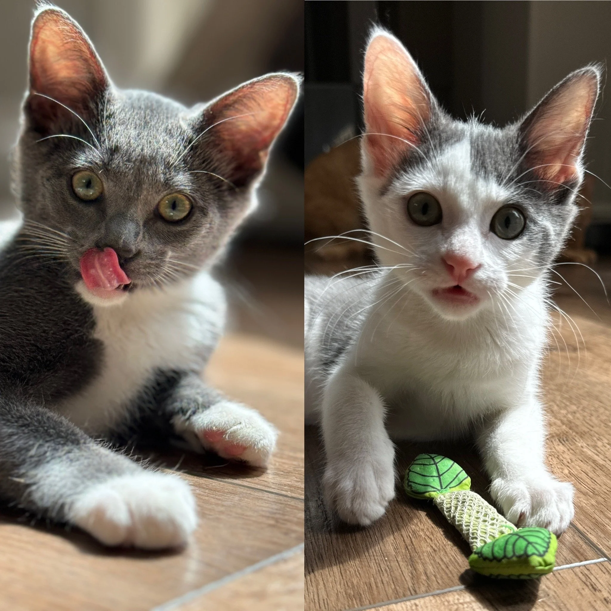 Periwinkle and Poppy are great with dogs. Peri on the left is very affectionate, kneads and suckles. Poppy LOVES our big dog, walks lock step next to her with her tail hugging her body.