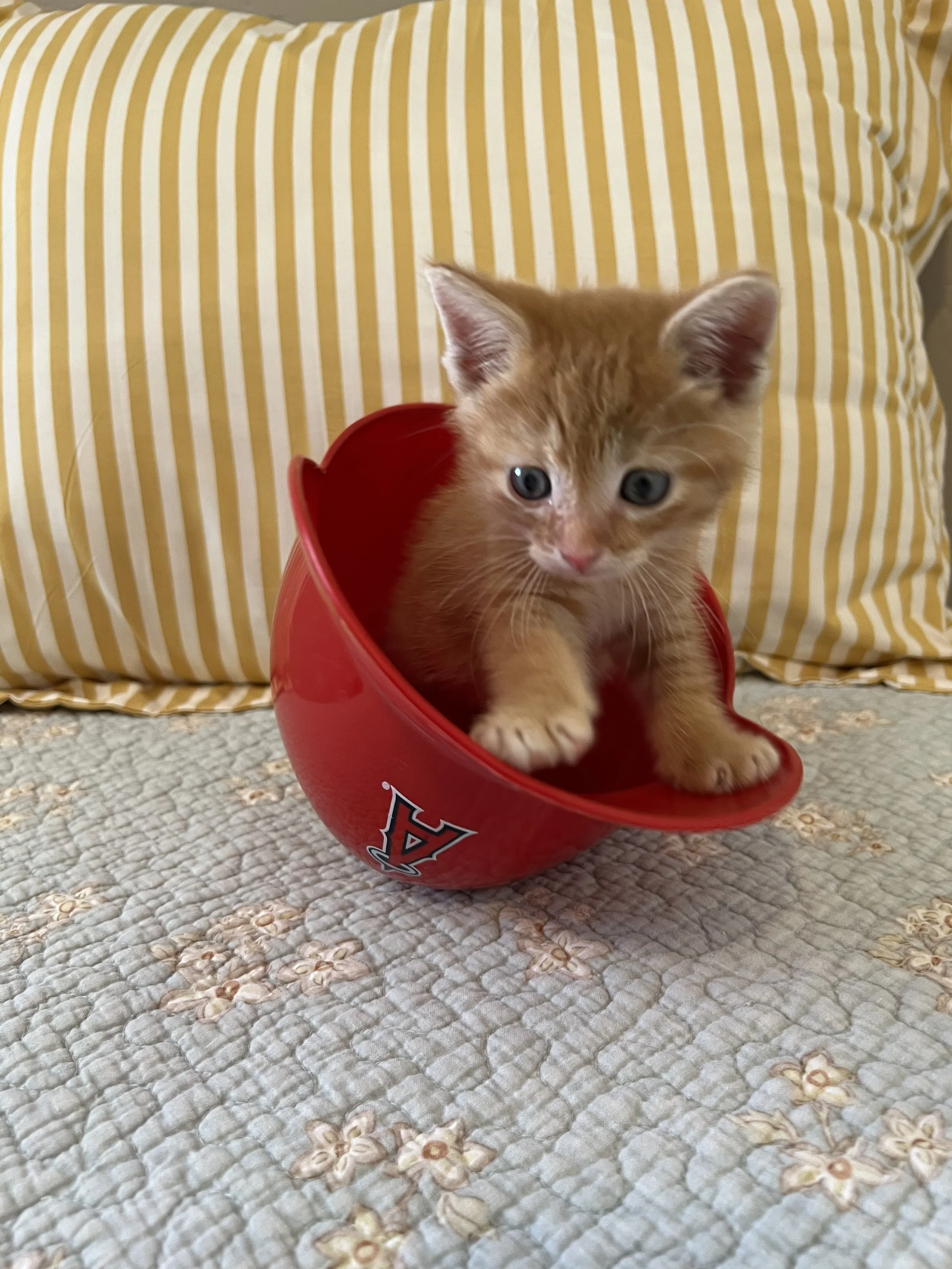 Weasley is a 5 week old kitten who was found in Long Beach all alone with his brothers and sisters. He is a very sweet and playful orange tabby. Weasley loves all of his toys and loves to receive and give kisses. He has a good appetite for wet food and is a champ at using his litter box. He also likes to be held and snuggle on your chest. Weasley would make a great addition to any family.